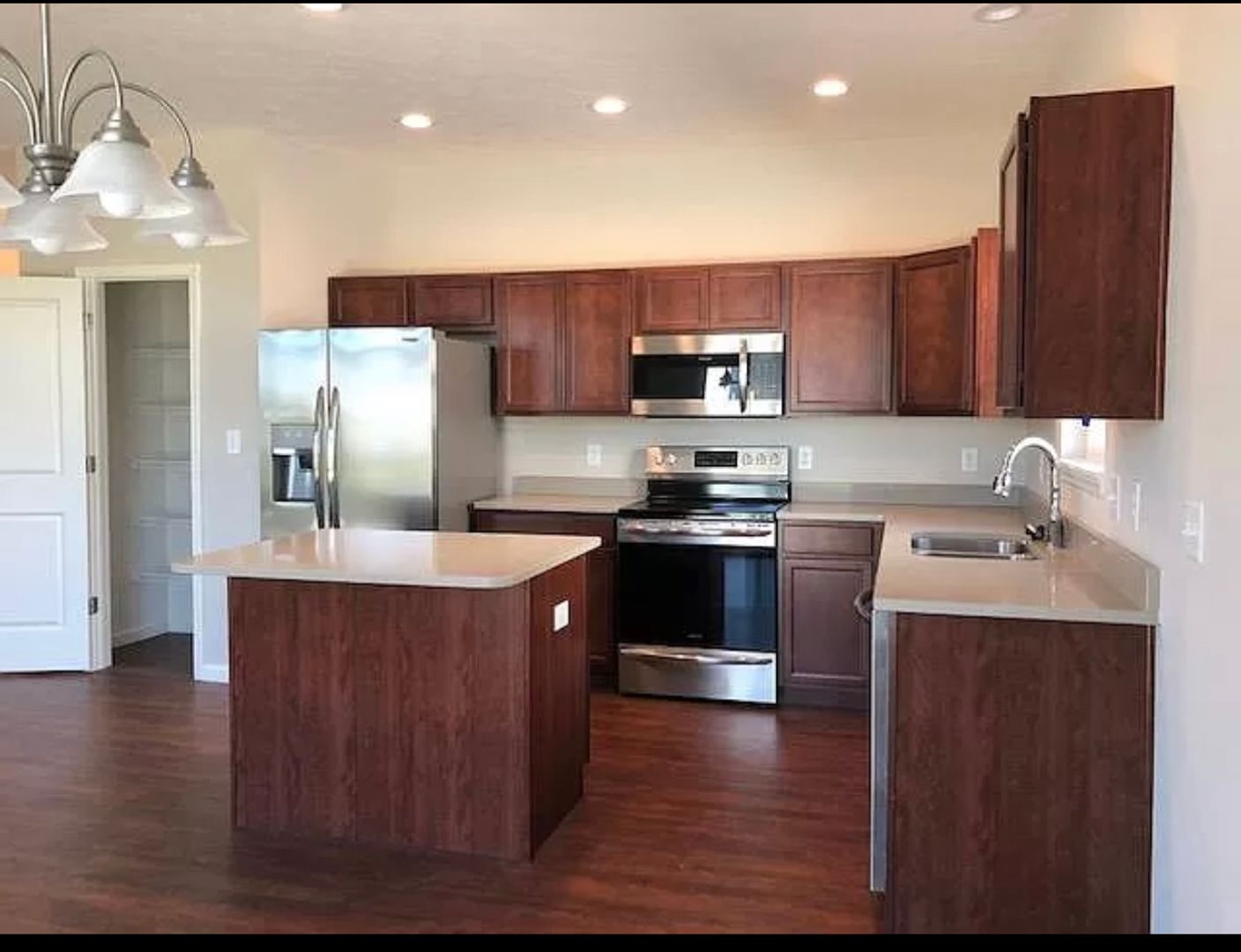 This 3-bedroom, 2 full bathroom ranch house can now be yours to rent. The house has 9' ceilings and an open floor concept. Front entry, kitchen, and living room come with beautiful, easy to maintain vinyl plank flooring. Gourmet kitchen with upgraded cabinets, Corian countertop, all stainless appliances, large center island, and a food pantry. Master bedroom with a huge walk-in closet. Master bath has 60" double vanity and walk-in shower. The other two bedrooms are spacious with good size closets. All bedrooms have overhead ceiling fans or lighting, and white blinds. Exterior features include a 14x14 patio and a fenced backyard. Tenant takes care of lawn care & snow removal.